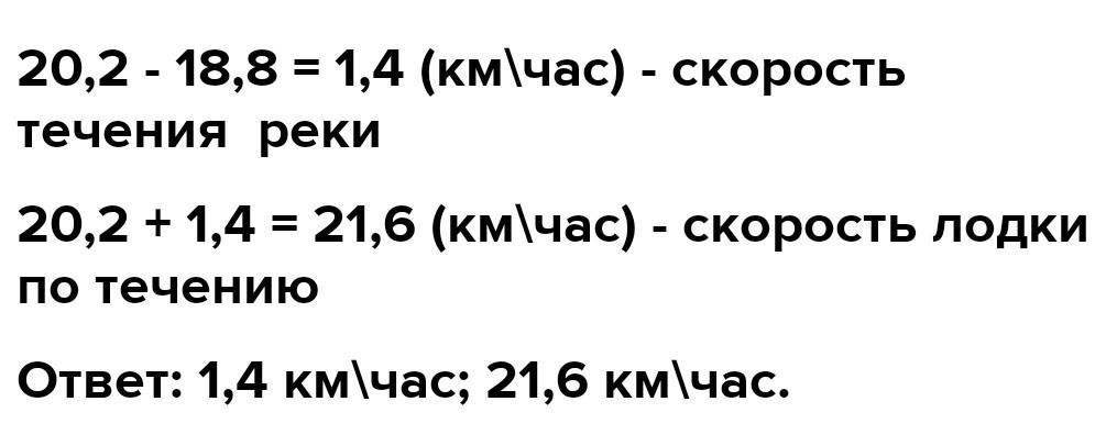 1) 20,2 - 18,8 = 1,4 (км/ч) - скорость течения реки