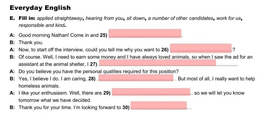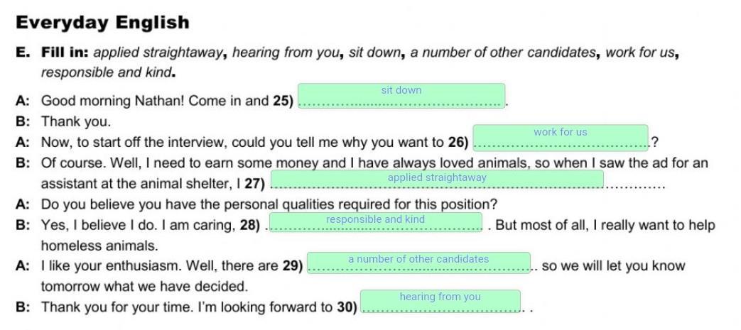 E. Fill in: applied straightaway, hearing from you, sit down, a number of other candidates, work for us, responsible and kind.
