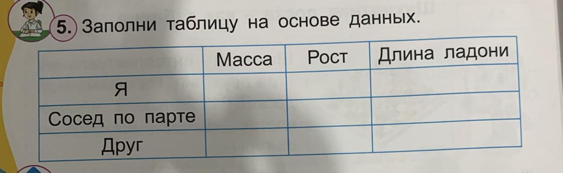 Нужно пойти к мед. сестре она сможет помочь с этим. В задании нужно написать свой рост длину ладоней и массу. После этого так-же зделать с соседом по парте.Или ты имел ввиду другое?