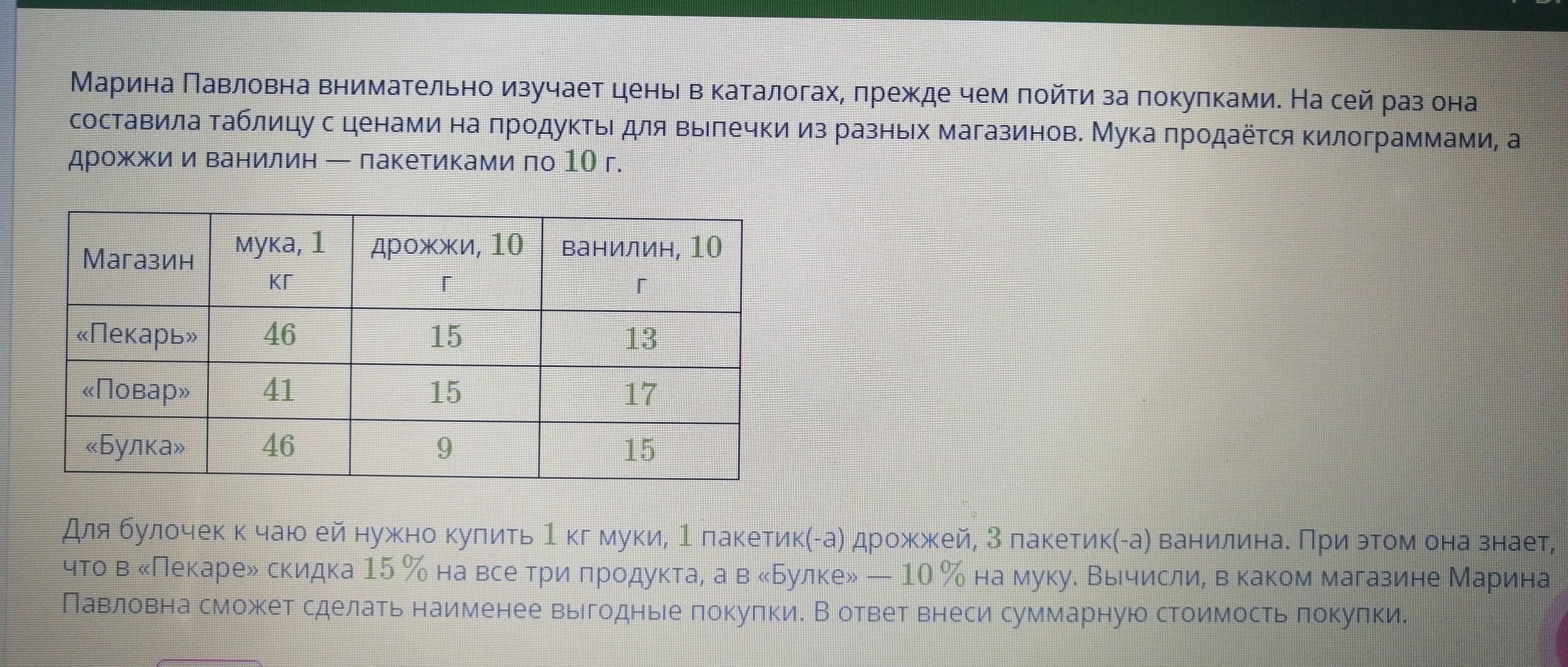 ИТОГО ОТВЕТ ПОЛУЧАЕТСЯ ЧТО В ПЕКАРЕ ВЫГОДНЕЕ БРАТЬ ПРОДУКТЫ ТАМ ВЫХОДИТ 84,9