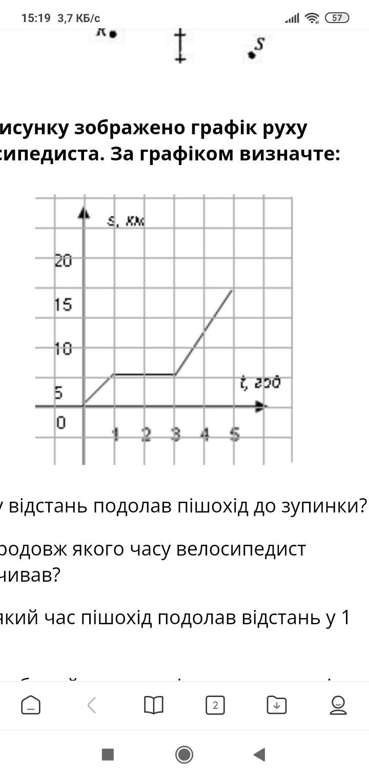 А) до остановки - 5 км (остановка на графике изображается отрезком, параллельным горизонтальной оси; видно, что до остановки по вертикальной оси велосипедист проехал 5 км);