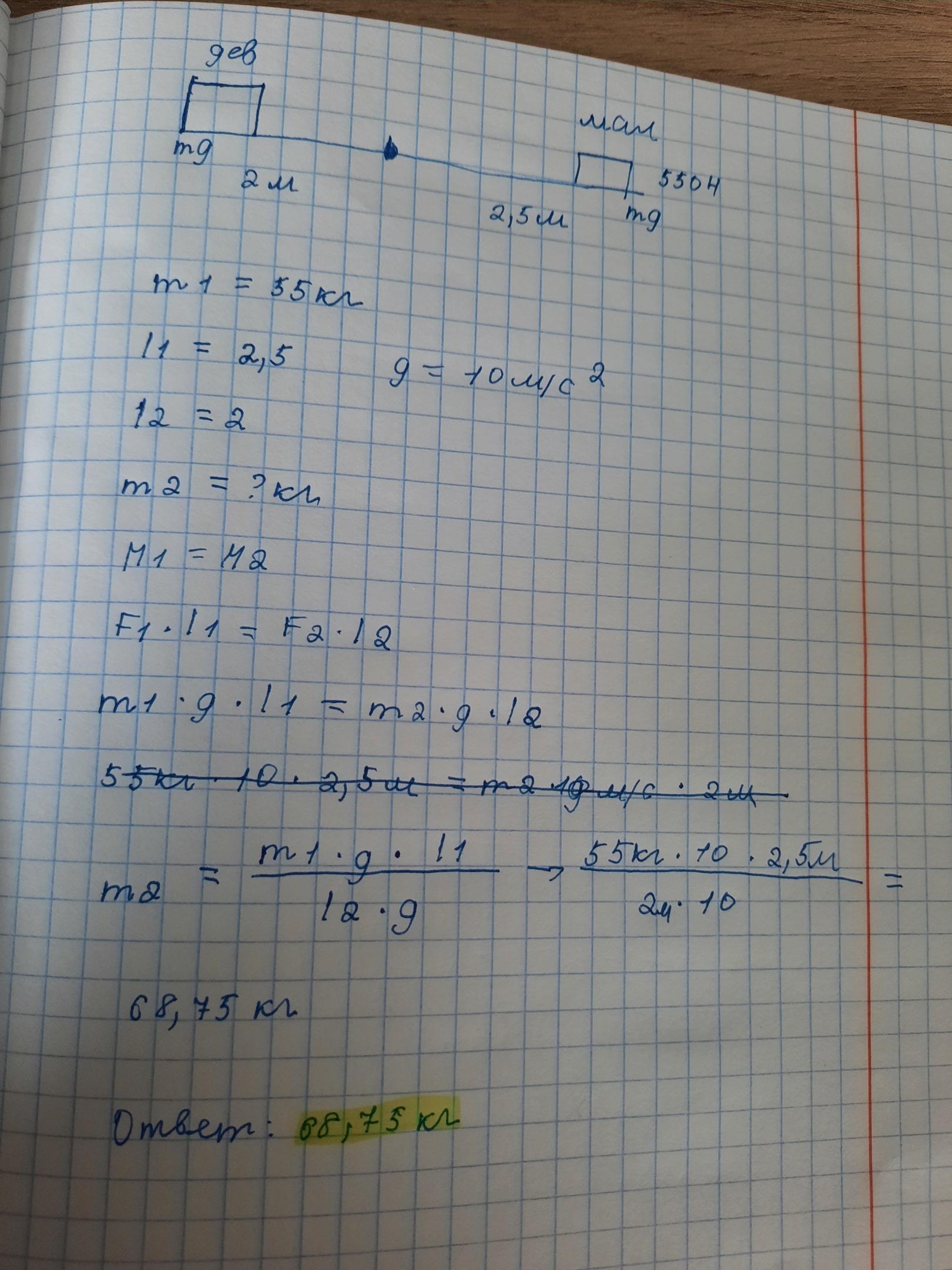 Дети качаются на качелях. Девочка Катя сидит на одном плече качели, длина которого равна 2 метра, а длина плеча, на котором сидит мальчик Иван, равна 2,5 метра. Найти массу девочки, если масса мальчика 55 кг, учитывая, что дети нашли равновесие качелей? (Ускорение свободного падения берём равным 10 м/с^2). P.S.