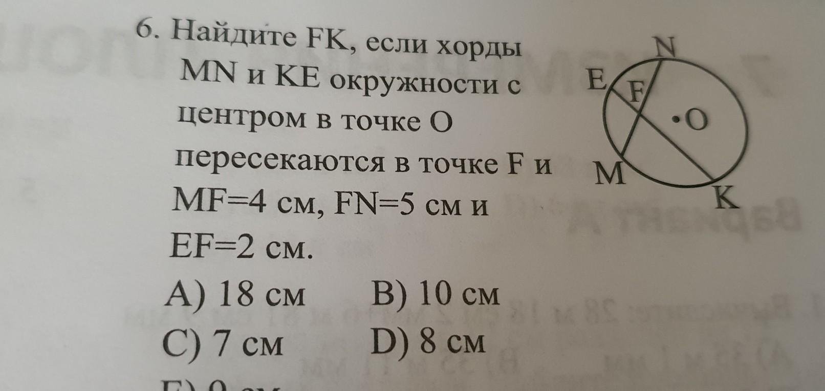 Найдите FK если хорды MN и KE окружности с центром в точке О пересекаются в точке F и