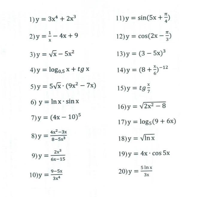 Может кто то разбирается в Дефференциальном исчислении,нужно найти производную ,помогите хотя бы с некоторыми примерами