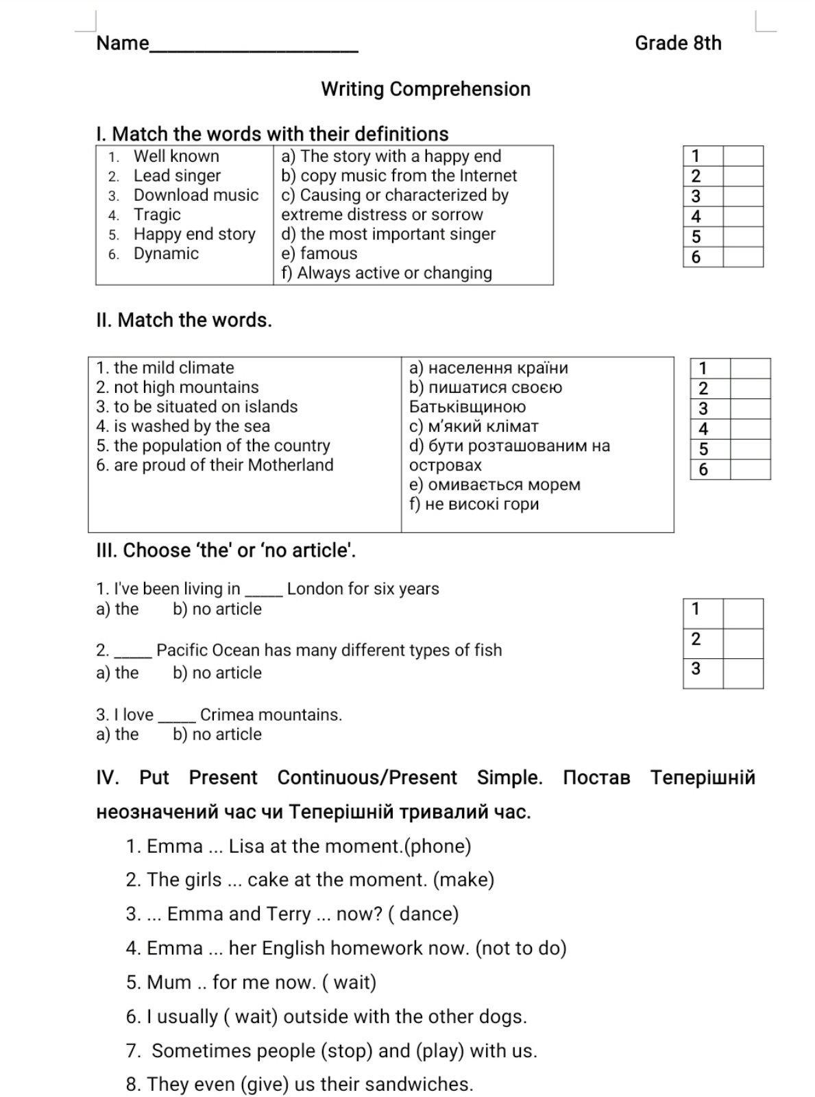 IV. 1. is phoning, 2. are making, 3. Are... dancing, 4. isn't doing, 5. is waiting, 6. wait, 7. stop play, 8. give.