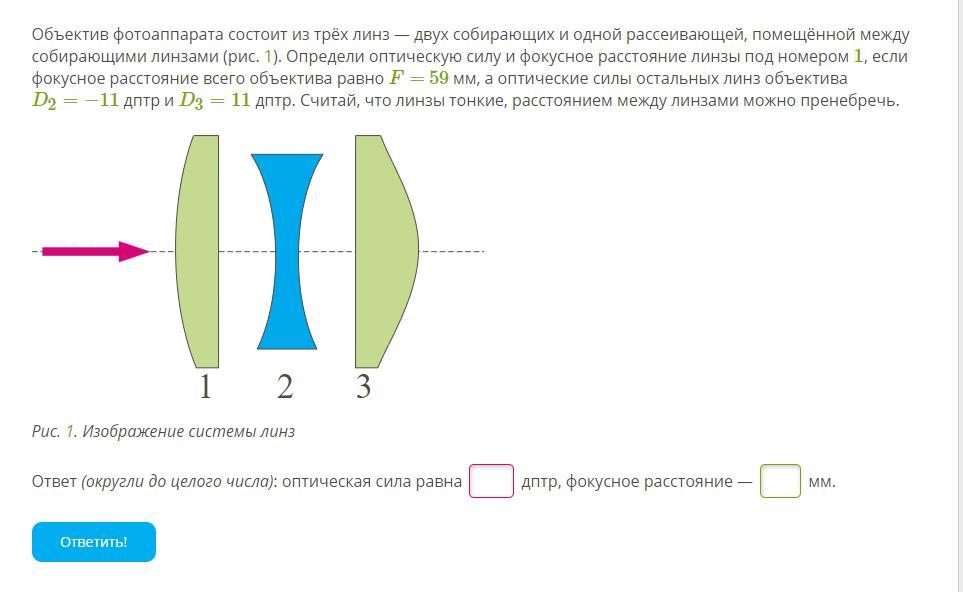 F=59 мм D2= -11 дптр D3=11 дптр D1=? F1=?
