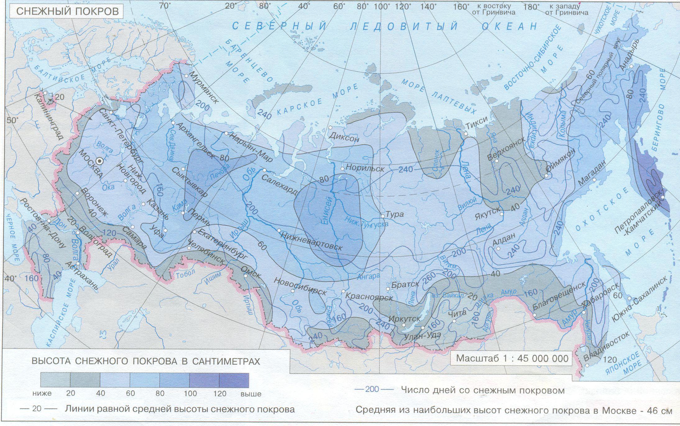 Больше всего снега в России выпадает на полуострове Камчатка.Карта снежного покрова дана ниже в приложении.