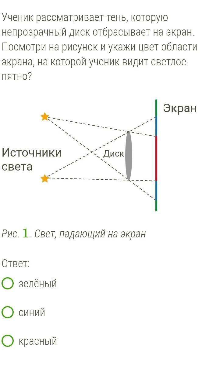 Ученик рассматривает тень, которую непрозрачный диск отбрасывает на экран. Посмотри на рисунок и укажи цвет области экрана, на которой ученик видит светлое пятно? Экран Диск Источники Света Рис. 1. Свет, падающий на экран Ответ: зелёный Осиний Окрасный