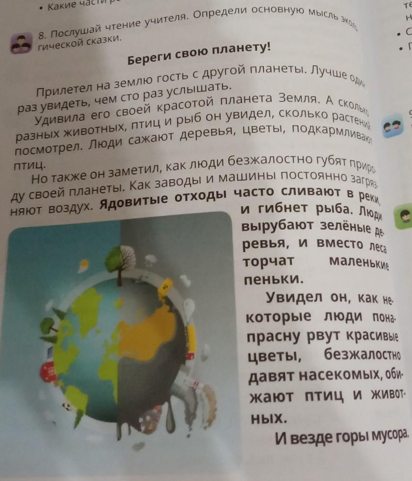 8.| Послушай чтение учителя. Определи основную мысль экое гической сказки.| Береги свою планету! раз увидеть, чем сто раз услышать. Прилетел на землю гость с другой планеты. Лучше один Удивила его своей красотой планета Земля. А сколько посмотрел. Люди сажают деревья, цветы, подкармливак разных животных, птиц и рыб он увидел, сколько растений птиц. Но также он заметил, как люди безжалостно губят приро- няют воздух. Ядовитые отходы часто сливают в реки, ду своей планеты. Как заводы и машины постоянно загряз. и гибнет рыба. Люди вырубают зелёные ревья, и вместо леса де торчат пеньки. маленькие цветы, Увидел он, как не. которые люди пона- прасну рвут красивые безжалостно давят насекомых, оби- жают птиц и живот- НЫХ. И везде горы мусора.