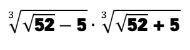 \displaystyle \sqrt[3]{\sqrt{52}-5 }*\sqrt[3]{\sqrt{52}+5 }=\sqrt[3]{(\sqrt{52}-5)(\sqrt{52}+5)  }=\sqrt[3]{(2\sqrt{13}-5)(2\sqrt{13}+5)  }=\sqrt[3]{4*13-25}=\sqrt[3]{52-25}=\sqrt[3]{27}=3