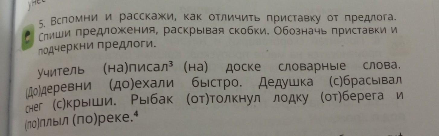 5. вспомни и расскажи как отличить приставку от предлока. Спищи предложения раскрывая скобки.Обозначь приставки и подчеркни предлоги.
