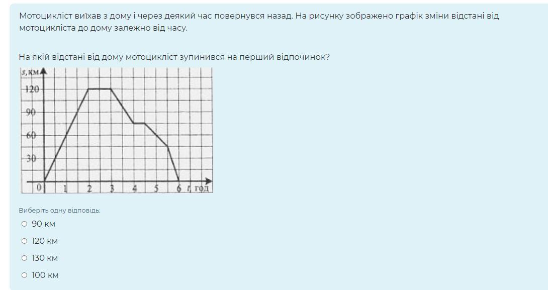 На якій відстані від дому мотоцикліст зупинився на перший відпочинок?
