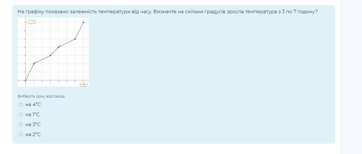 На графіку показано залежність температури від часу. Визначте на скільки градусів зросла температура з 3 по 7 годину?