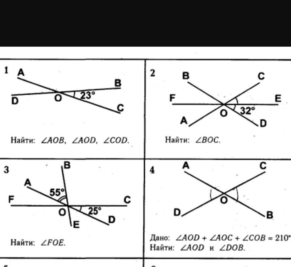 Ответ 1AOB=157, AOD= 23 COD=157 2 BOC=116 3 FOE=100 4 DOB=150 AOD=30