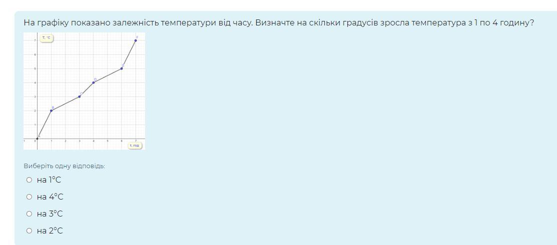 На графіку показано залежність температури від часу. Визначте на скільки градусів зросла температура з 1 по 4 годину?