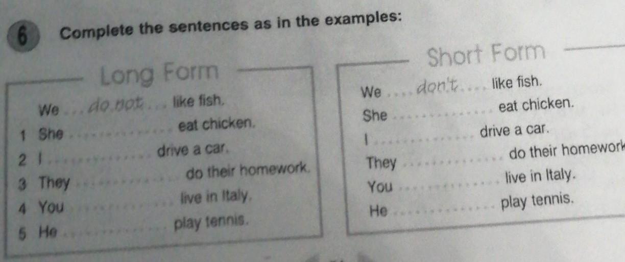 6 Complete the sentences as in the examples: We 1 She 21 3 They 4 You 5 He Long Form do not like fish eat chicken drive a car do their homework live in Italy play tennis We She 1 They You Short Form dont kelish cat chicken drive a car do their homework live in Italy play tennis He 54