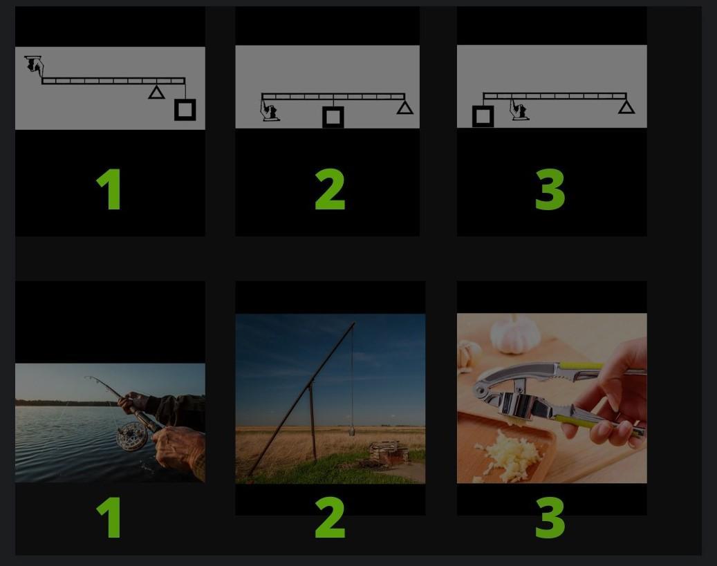 Установите соответствие между анимационными схемами рычагов 1,2 и 3-го рода и их реальными примерами.