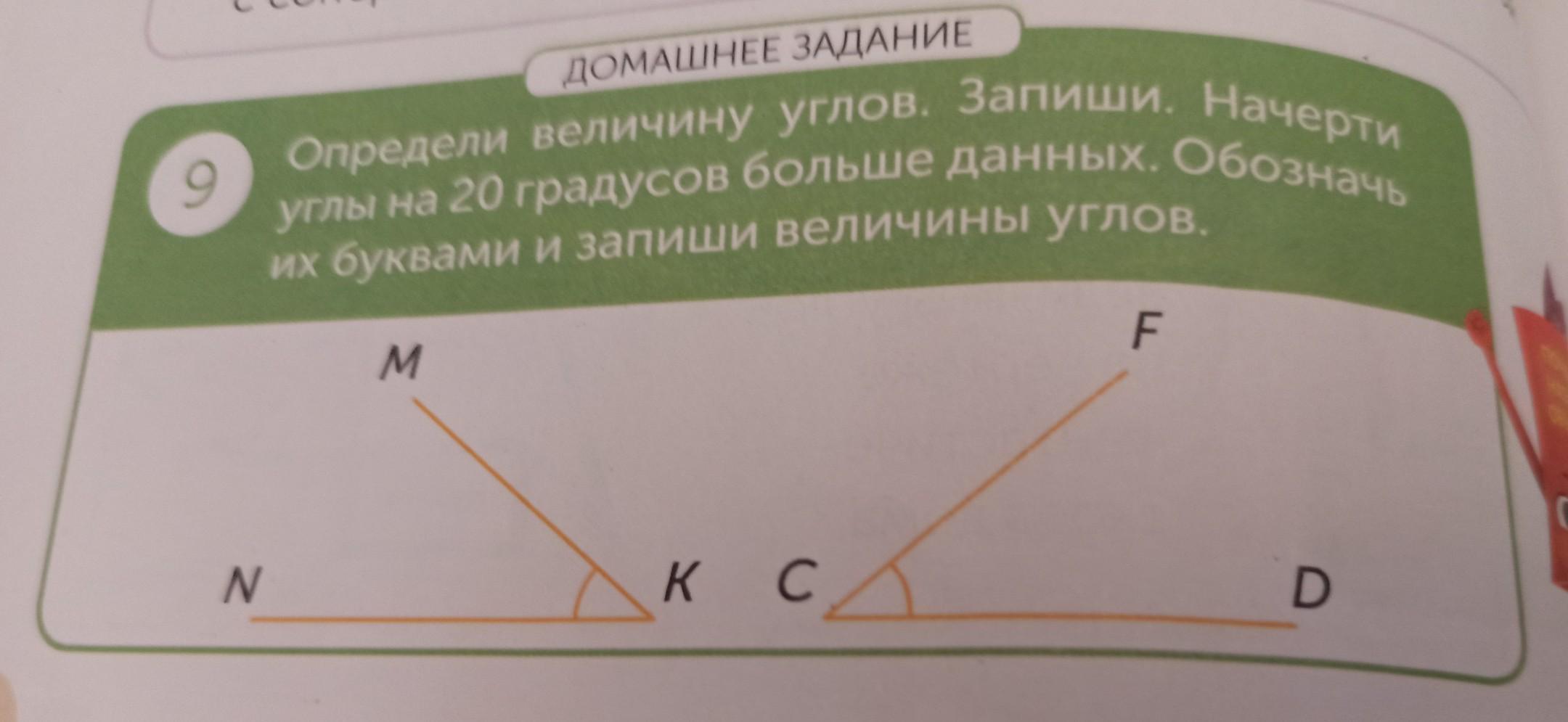 с соп 9 ДОМАШНЕЕ ЗАДАНИЕ Определи величину углов. Запиши. Начерти углы на 20 градусов больше данных. Обозначь их буквами и запиши величины углов. F. M N КС C D