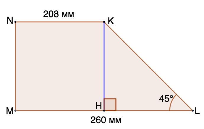 Дана прямоугольная трапеция MNKL с основаниями ML=260мм и NK = 208мм. Найди её площадь, если ∠KLM=45°. Вырази ответ в дм^2.