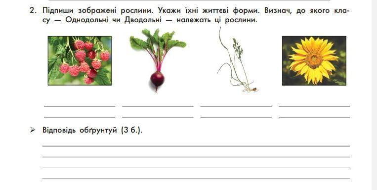 2. Підпиши зображені рослини. Укажи їхні життєві форми. Визнач, до якого кла- су — Однодольні чи дводольні належать ці рослини.