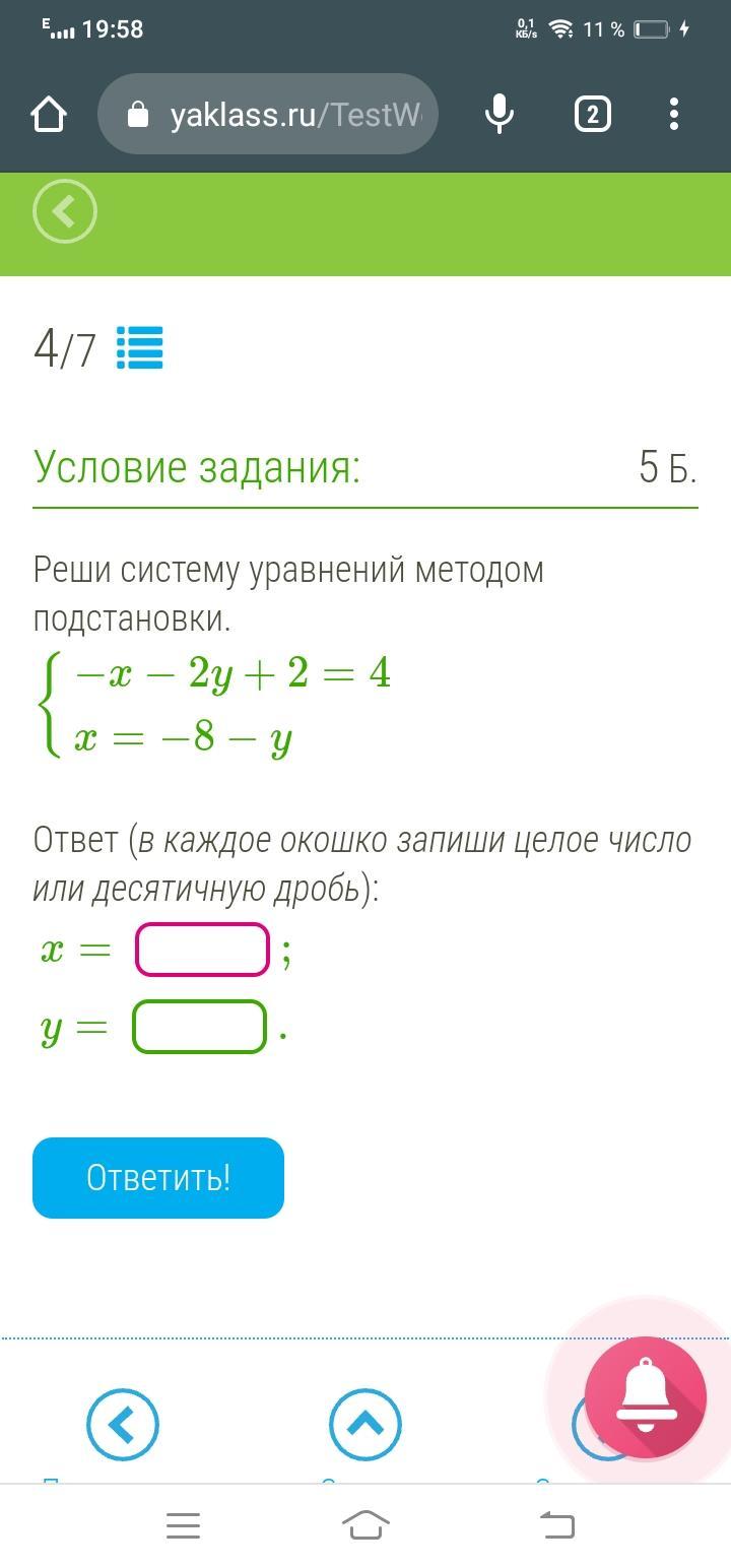 \displaystyle\bf\\\left \{ {{-x-2y+2=4} \atop {x=-8-y}} \right. \\\\\\\left \{ {{-(-8-y)-2y=4-2} \atop {x=-8-y}} \right. \\\\\\\left \{ {{8+y-2y=2} \atop {x=-8-y}} \right. \\\\\\\left \{ {{-y=2-8} \atop {x=-8-y}} \right. \\\\\\\left \{ {{y=6} \atop {x=-8-6}} \right. \\\\\\\left \{ {{y=6} \atop {x=-14}} \right. \\\\\\x= \ \boxed{-14}\\\\\\y= \ \boxed6