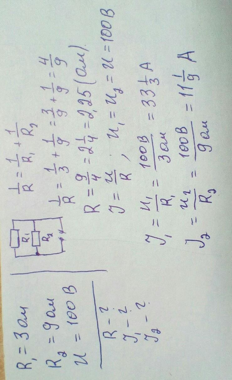 Дві дротини мають опір 3 і 9 Ом. З'днані вони між собою паралельно. Вольтметр показає 100 В. Визначте загальний опір, силу струму у кожній дротині.