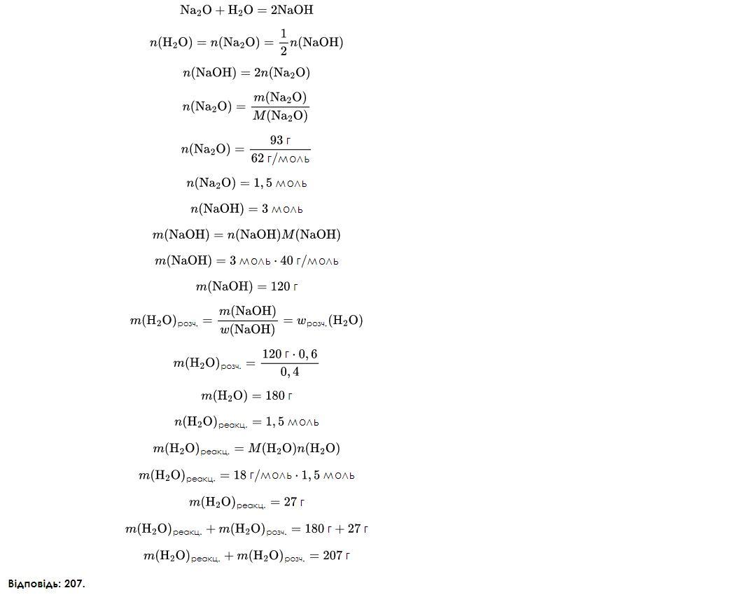 4) Обчисліть масу (г) води, до якої необхідно добавити натрій оксид масою 93 г, щоб утворився розчин натрій гідроксиду з масовою часткою лугу 40 %.