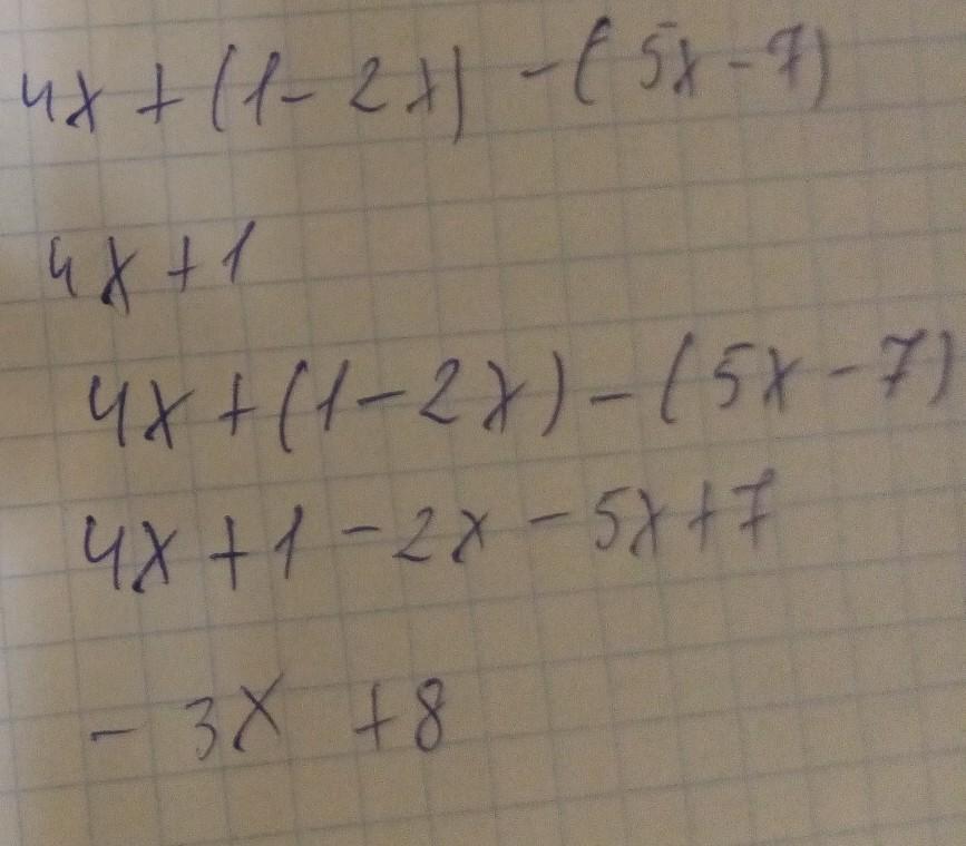 4х+(1-2х)-(5х-7)=4х+1-2х-5х+7=4х-2х-5х+1+7=-3х+8=8-3х