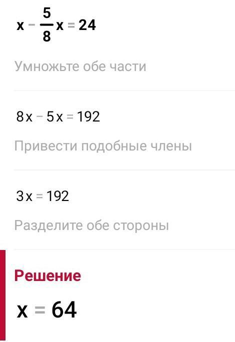 Пусть в бочке имеется х литров воды. Когда из бочки отлили 5/8 имевшейся в ней воды, то из нее вылили 5/8 * х литров воды. Нам известно, что после этого в бочке осталось 24 л