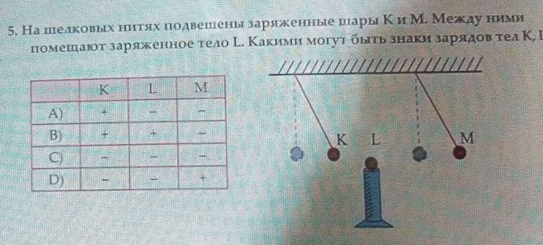 Ответ А, потому что притягиваются тела только противоположных зарядов ( + и - ), К притягивается к Л, т е у них противоположные заряды, это только в ответе А. М и Л отталкивается значит у них одноименные заряды это тоже подтверждается в ответе А