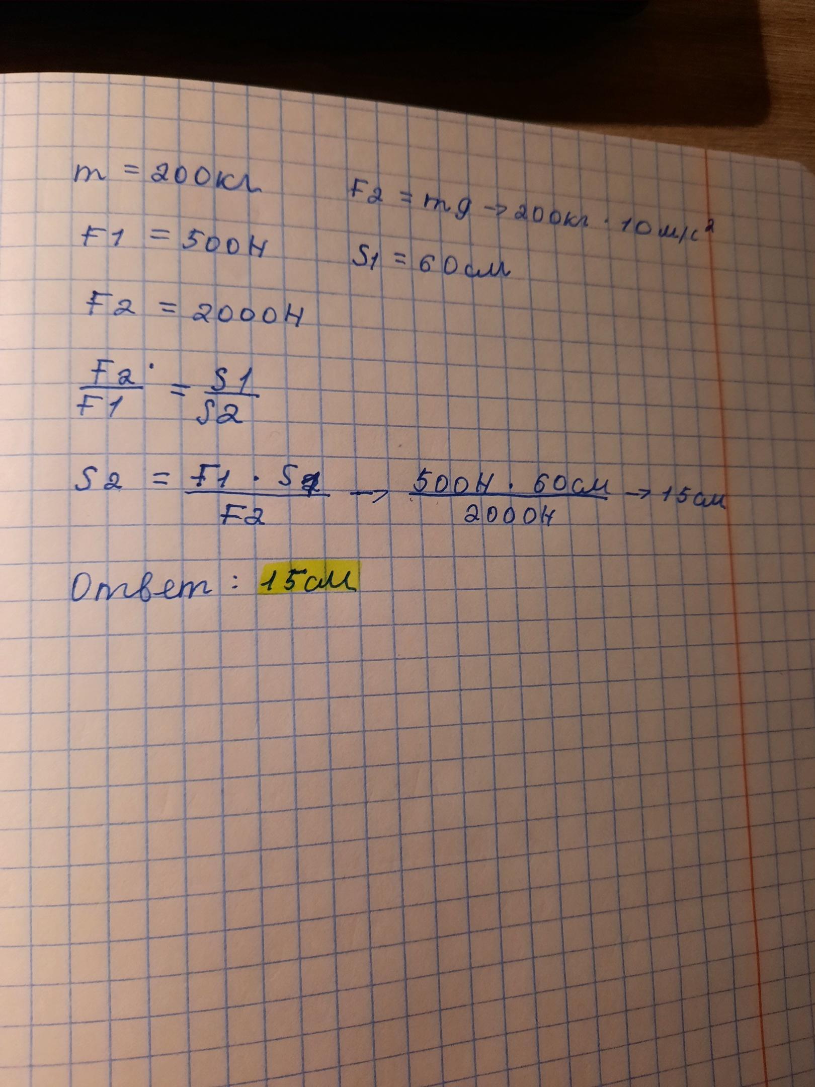 С помощью рычага подняли груз массой 200 кг . На какую высоты был поднят груз , если сила , действующая на длинное плечо рычага , была равна 500 H?, и точка приложения силы переместилась на 60 см?