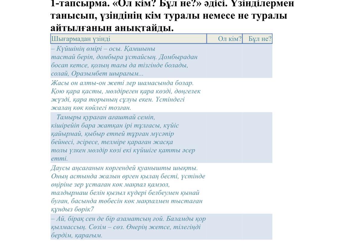 1-тапсырма. «Ол кім? Бұл не?» әдісі. Үзінділермен танысып, үзіндінің кім туралы немесе не туралы айтылғанын анықтайды. (скрин)