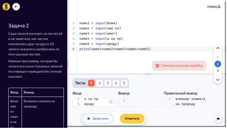 Конкретно в данном коде ошибка в том, что а input слова вписаны без ковычек. То есть, чтобы программа просто запустилась надо писать input("Валя"), а не input(Валя). Но в данной задаче это не будет верное решение. Ведь input("Валя") кроме того, чтобы считывать введеное слово, будет его выводить на экран. А нам это не надо