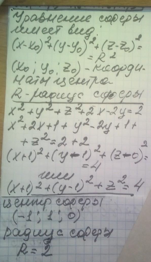 2. Приведите данное уравнение к стандартному виду уравнения сферы и найдите координаты се центра и величину радиуса: x²+y²+z²+2x-2y=2