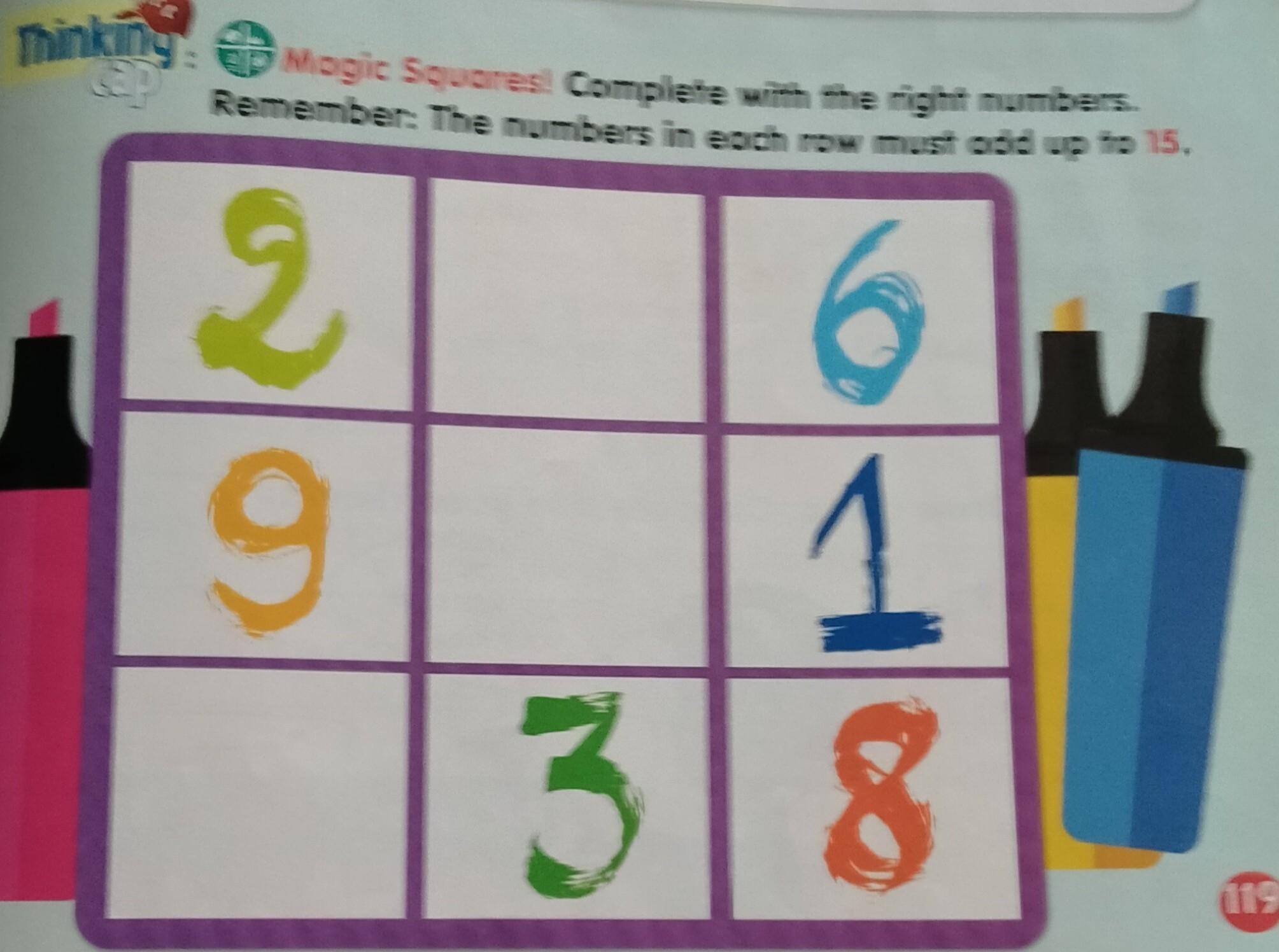 Thinking: Magic Squares Complete with the right numbers, cap Remember: The numbers in each row must add up to 15.