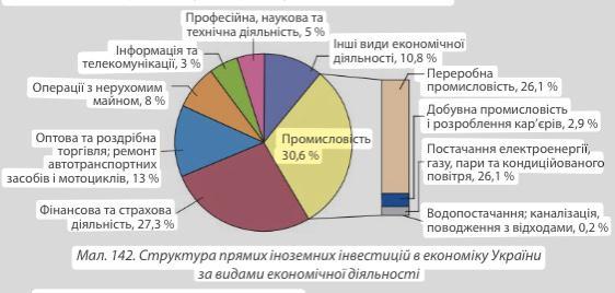 Проаналізуйте діаграму структури прямих іноземних інвестицій в економіці України за видами економічної дiяльностi (див. мал. 142). З'ясуйте, якi сфери еконо міки й чому є найбільш привабливими для iноземних інвесторів.