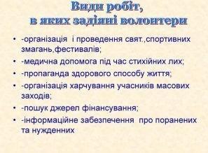 Волонтери — багатство народів. Волонтерство ґрунтується на добровільності, співчутті, солідарності з потребами та ідеями інших, а також глибокій повазі до всіх людей. Свій вільний час волонтери присвячують суспільним справам, беручи участь у всіляких акціях, програмах соціальної взаємодопомоги, культурного просвітництва тощо.Волонтерська діяльність, як прояв милосердя і доброчинності, буде існувати доти, доки існує потреба людей у тій чи іншій допомозі та обмежена державна участь у задоволенні потреб своїх громадян, їхній соціальній підтримці.