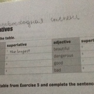 Первый столбик он серый)) long, big, small, ugly. Столбик рядом с ним белый в первой строчке написано The longest и дальше нечего. Второй серый столбик там написано beautiful, dangerous, good, bad. В последнем не чего)) задание заполнить таблицу( complete the table)