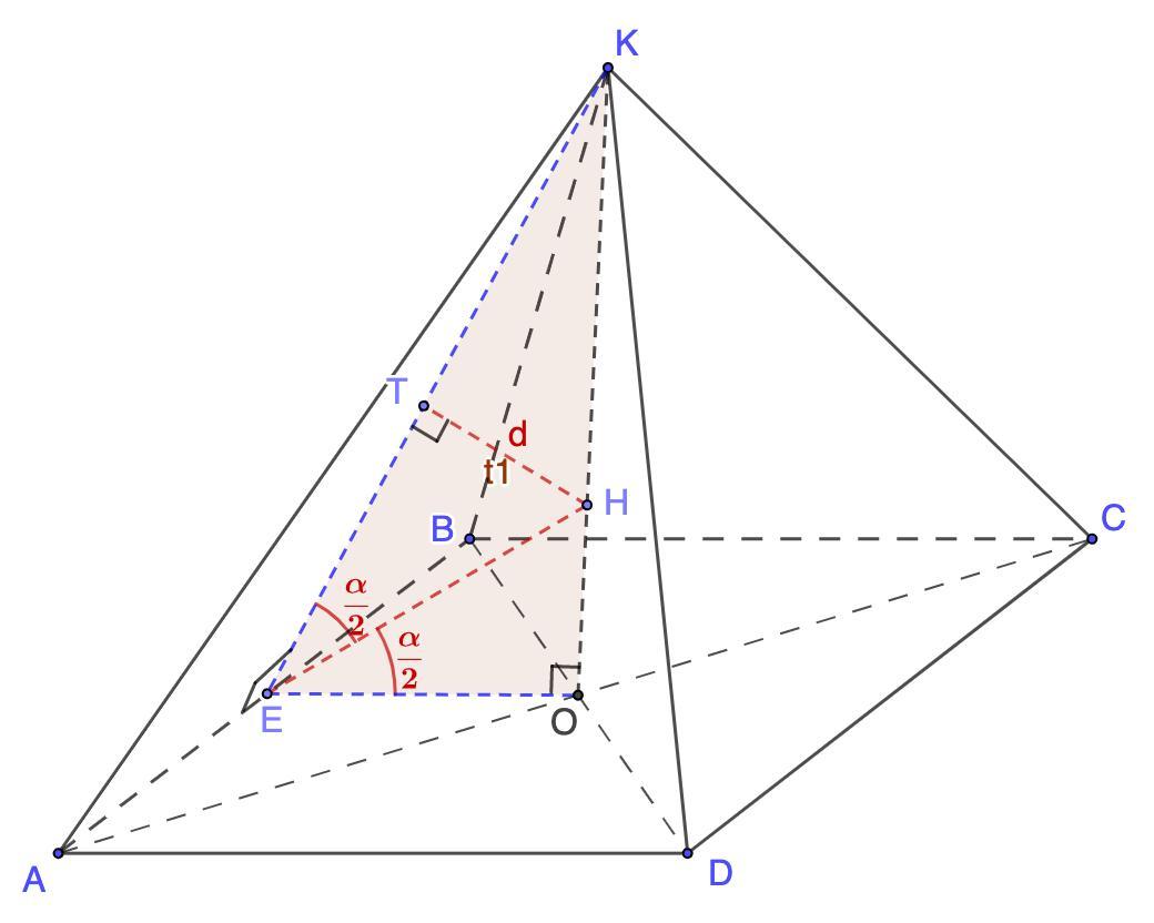 В правильной четырехугольной пирамиде угол между апофемой и плоскостью основания равен α. Биссектриса этого угла пересекает высоту пирамиды в точке, которая размещена на расстоянии d от апофемы. Найдите боковую поверхность пирамиды.