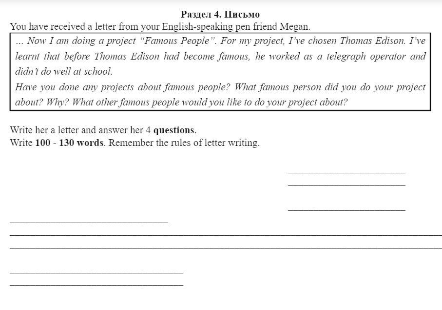Раздел 4. Письмо You have received a letter from your English-speaking pen friend Megan. … Now I am doing a project “Famous People”. For my project, I’ve chosen Thomas Edison. I’ve learnt that before Thomas Edison had become famous, he worked as a telegraph operator and didn’t do well at school. Have you done any projects about famous people? What famous person did you do your project about? Why? What other famous people would you like to do your project about? помогите написать письмо