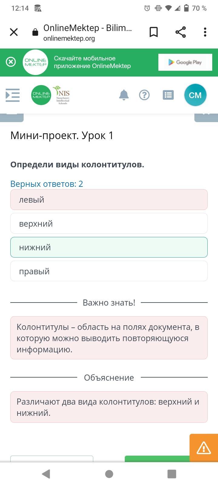 Мини-проект. Урок 1 Определи виды колонтитулов. Верных ответов: 2 правый нижний левый верхний Назад Проверить