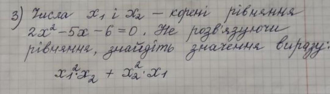 Числа x1 і x2 - корені рівняння 2x²-5x-6=0 , не розв'язуючи рівняння знайдіть значення виразу x1²×x2+x2²×x1 Фото додається
