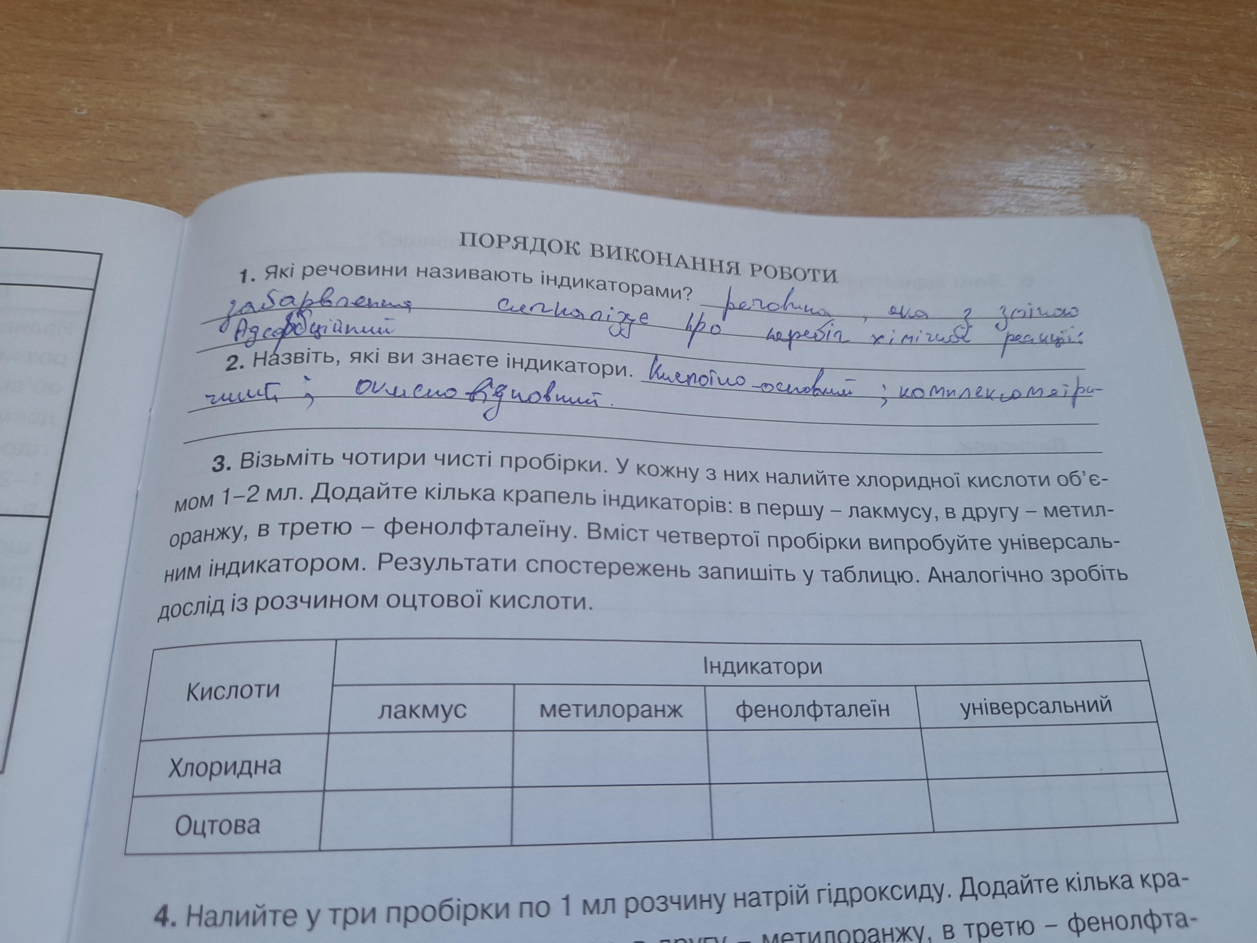 візьміть чотири чисті пробірки . У кожну з них налийте хлоридної кислоти об'ємом 1-2мл. Додайте кілька капель індикаторів: в першу лакмусу, в другу метилоранжу , в третю фенолфталеїну. Вміст четвертої пробірки випробуйте універсальним індикатором . ПОМОГИТЕ ПОЖАЛУЙСТА!!!!!