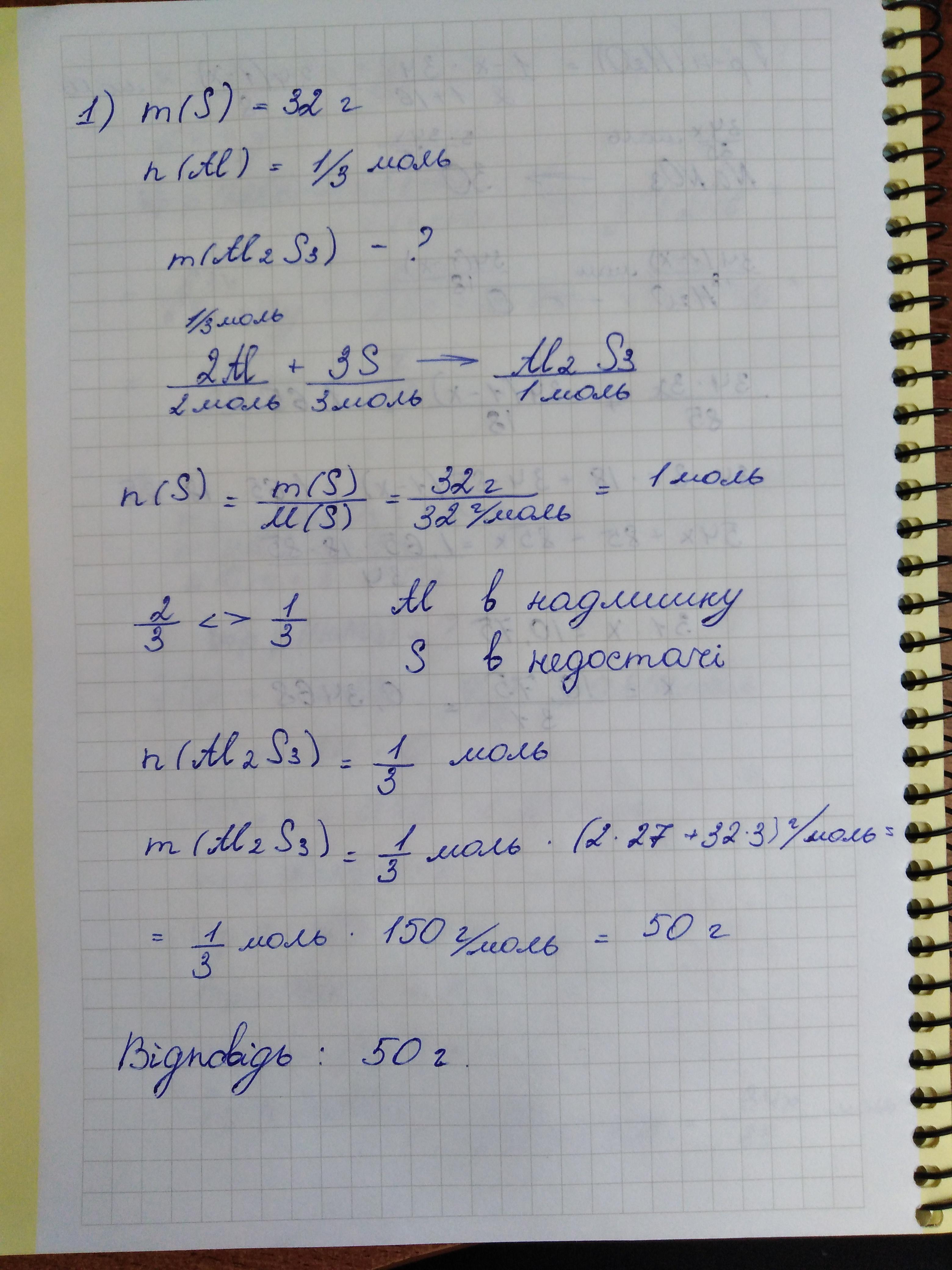 1)Змішали 32 г сірки і 1/3 моль алюмінієвих ошурок. Суміш нагріли. Визначити масу добутого алюміній сульфіду. (відповідь - ціле число)