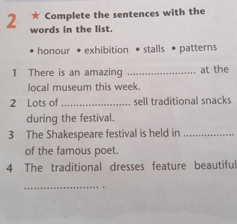 2. * Complete the sentences with the words in the list. • honour • exhibition • stalls • patterns