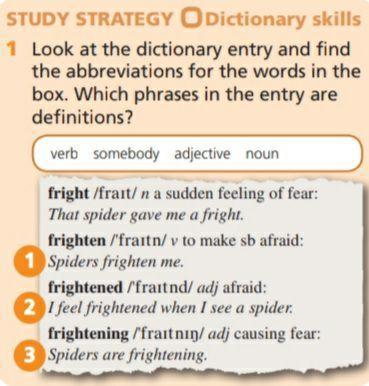 Look at the dictionary entry and find the abbreviations for the words in the box. Which phrases in the entry are definitions? verb somebody adjective noun