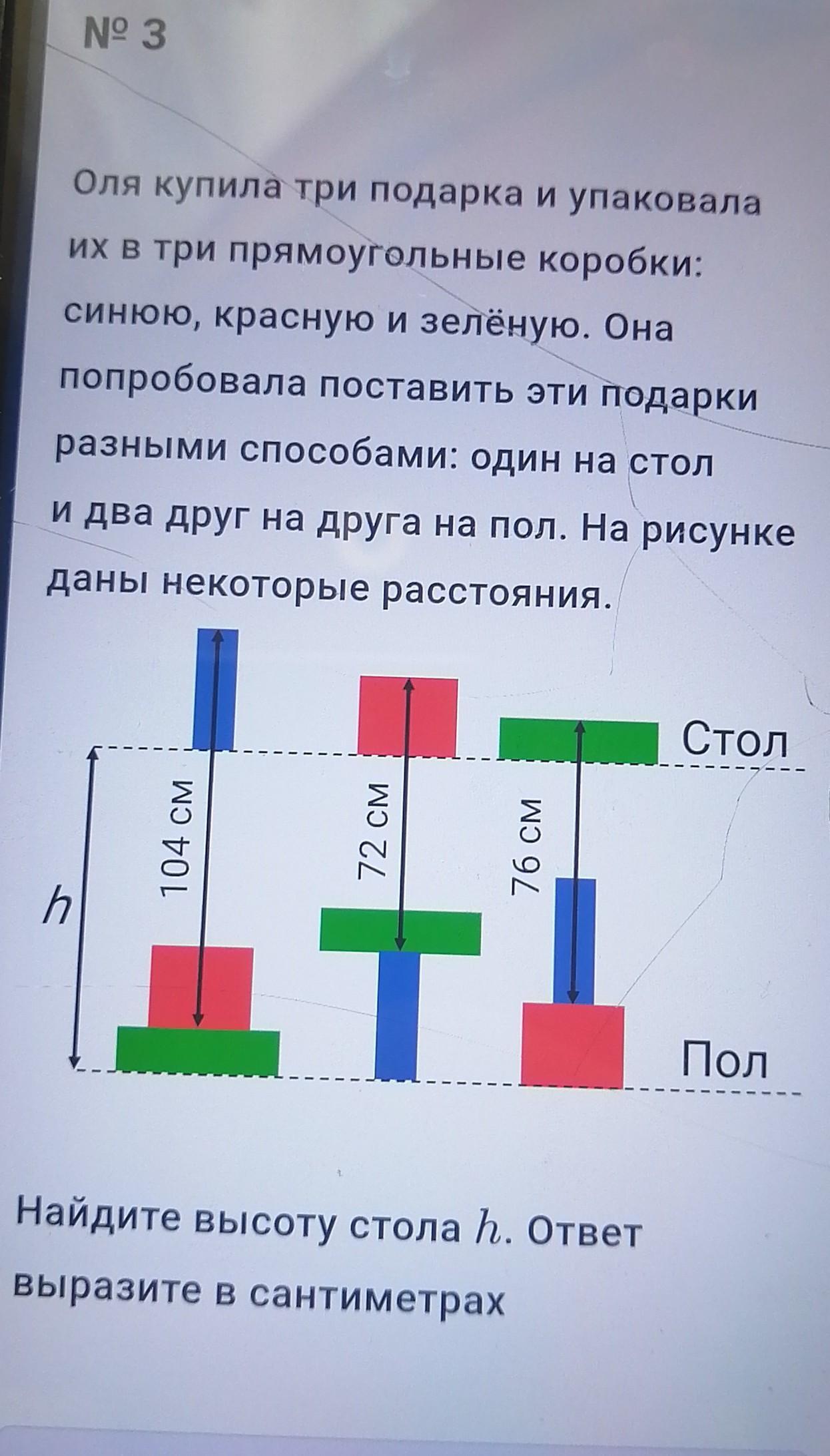 Оля купила три подарка и упаковала их в три прямоугольные коробки: синюю, красную и зелёную. Она попробовала поставить эти подарки разными способами: один на стол и два друг на друга на пол. На рисунке даны некоторые расстояния. Стол 104 см 72 см h IT ! Пол Найдите высоту стола һ. Ответ выразите в сантиметрах