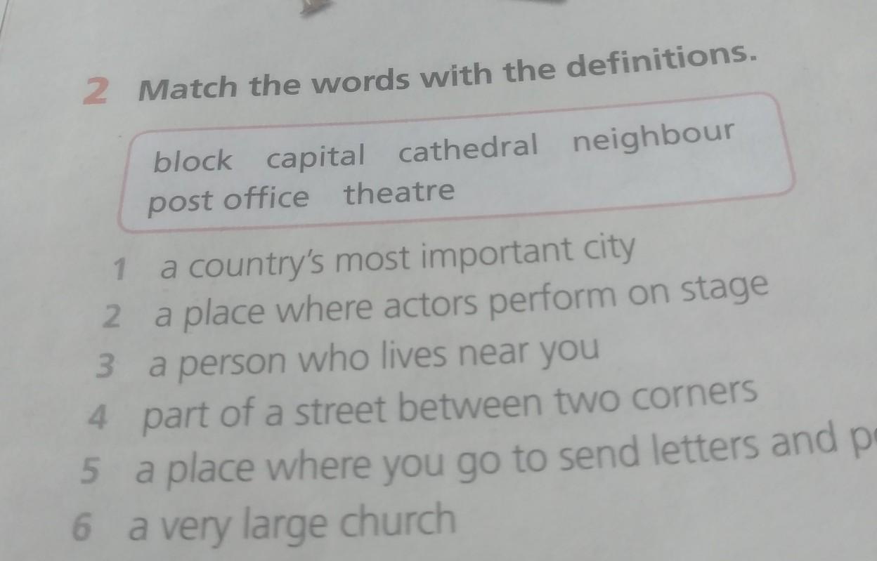 2 Match the words with the definitions. block capital cathedral neighbour post office theatre 1 3 a country's most important city 2 a place where actors perform on stage a person who lives near you 4 part of a street between two corners 5. a place where you go to send letters and postca a very large church 6 3 Match the sentences. Can you see the a It's cheaper than