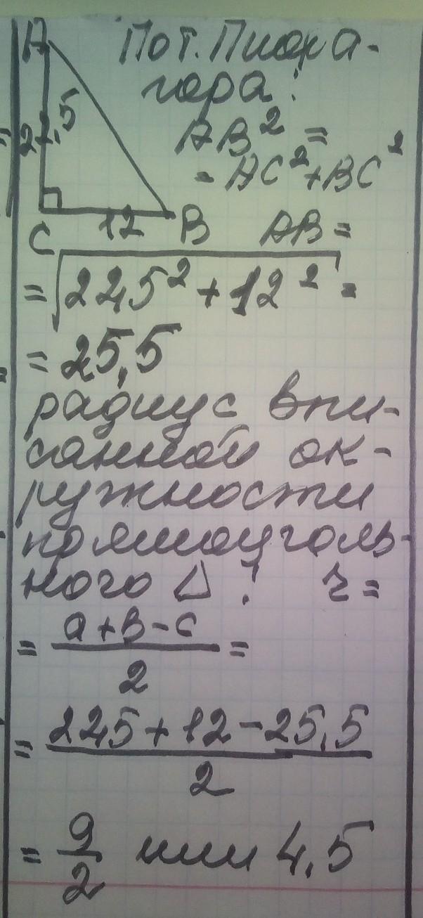 в треугольнике abc ac = 22,5, bc = 12, угол c равен 90 градусов найдите радиус вписанной окружности