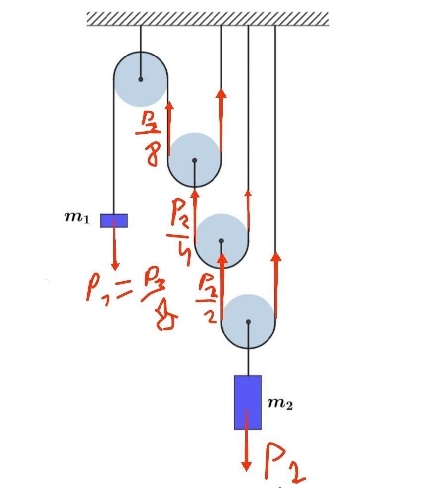 В рисунке, скинул, я отметил блоки. На первый блок действует сила ,равная весу тела m(2), на второй блок действует вдвое меньшая сила P= P(2)/2, на третий P(2)/4, на четвертый P(2)/8, неподвижный блок выигрыш в силе не даёт, поэтому вес груза P(1) в 8 раз меньше веса P(2), значит вес P(2) больше в 8 раз, чем P(1).